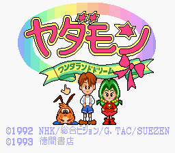 下の3人組が主人公トリオ、右が人間界に修行にやってきた魔女ヤダモン、中がヤダモンの居候先の男の子ジャン、左がヤダモンを追いかけてきた妖精タイモンです。